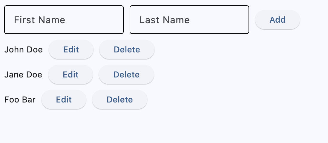 The behavior in both examples stays the same - in the app you can see the list of users, add user, inline edit with save/cancel buttons and delete. This is how this simple app looks in both examples: